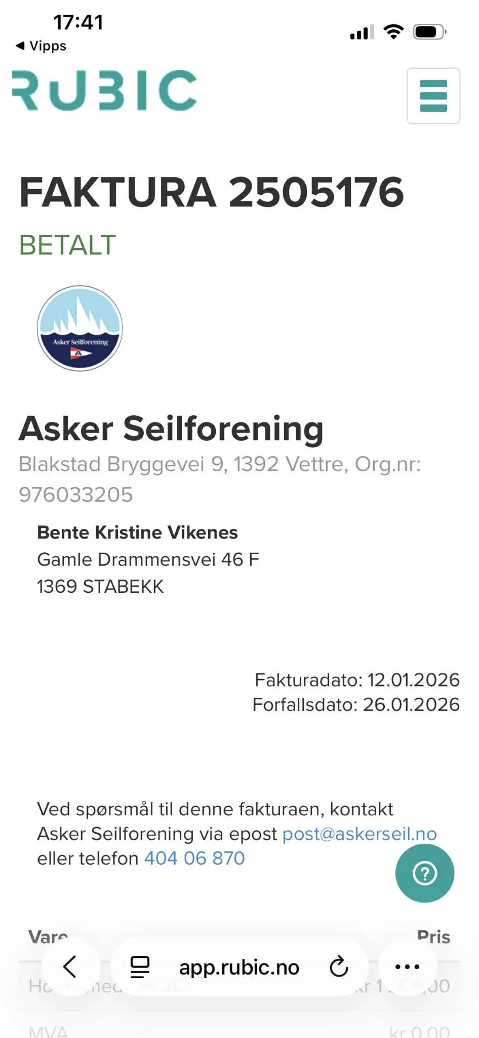 Du skal nå ha mottatt faktura for medlemskontingenten via e-post fra Asker Seilforening i Rubic.